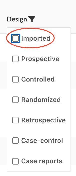 Imported series are categorized under the “Imported” study design. To make them permanently visible, you need to assign a different study design.